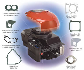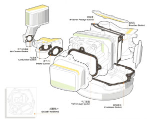 | 1、空气滤清器(Air cleaner gasket) 2、化油器(Carburetor gasket) 3、进气口(Intake gasket) 4、气门室盖(Valve cover gasket) 5、通风孔(Breather gasket) 6、呼吸槽(Breather passage gasket) 7、曲轴箱体(Crankcase gasket) |