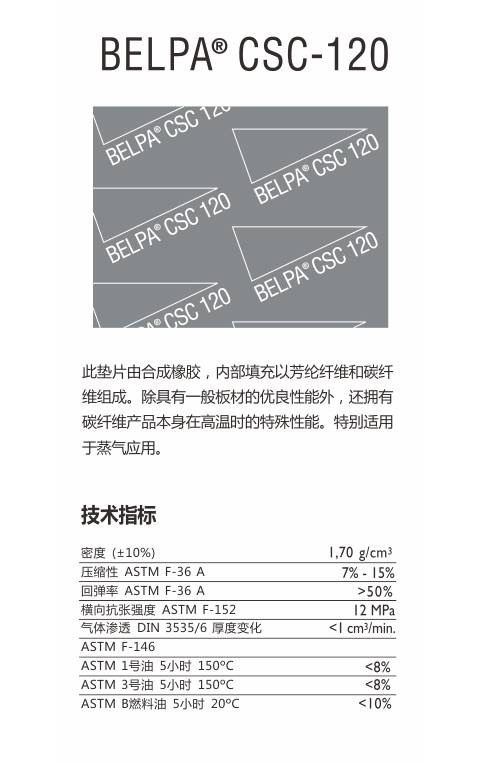 ELPA CSC-120 蒸汽用无石棉密封垫片,由合成橡胶,内部填充芳纶纤维和碳纤维组成,具有耐高温的特性