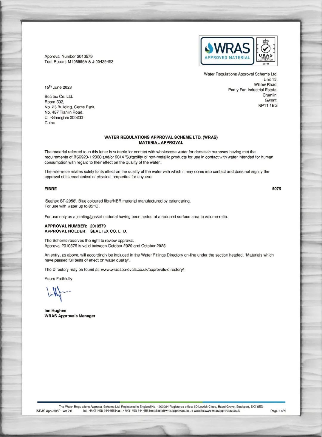 SealTex索拓ST-2058无石棉密封材料通过WRAS(Water Research Advisory Scheme)认证。