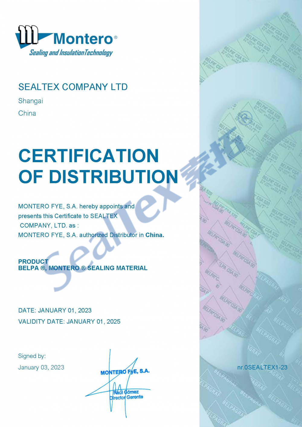同时代理了全球多家密封品牌,如:美国InterFace因特费斯、西班牙MONTERO标牌、葡萄牙AMORIM阿莫林、德国VICTOR REINZ莱茵茨、奥地利TEADIT泰迪、英国FLEXOID福来德等
